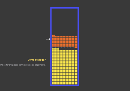 Em vez de desenvolver mais um painel de informações com uma composição de gráficos tradicionais, utilizamos a metáfora (e remetemos à memória afetiva) do tradicional jogo de computador "Tetris". Cada R$ 1 bilhão foi representado como um de vários quadrados, organizados em grade, como blocos de Tetris. Os juros, os pagamentos e a dívida são todos ilustrados no estilo do jogo, com blocos que caem do topo e ora se empilham, ora desaparecem, mostrando como a dívida cresce (ou diminui) com o tempo.