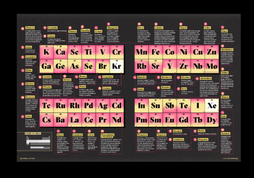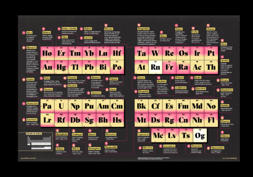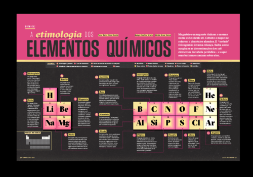 Matéria da Revista Superinteressante de 6 páginas focada na origem dos nomes dos elementos químicos. A reportagem se apoia em uma visualização de dados eficiente e na estrutura-base da tabela periódica aqui desmembrada para estruturar a narrativa. A Superinteressante é a maior revista de divulgação científica do Brasil. Em 1992, a publicação ganhou o Prêmio José Reis de Divulgação Científica e em 2002, o Prêmio Malofiej concedeu o título de revista que melhor usa infográficos no mundo.