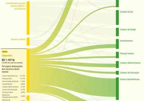 O projeto é uma visualização de dados interativa que busca demonstrar, de forma inédita, a vinculação entre receitas e despesas públicas, agrupando as receitas e despesas em categorias, com o intuito de simplificar a extensa classificação orçamentária adotada no setor público brasileiro. A vinculação é visualizada por meio de um gráfico aluvial, ou um diagrama de Sankey. O projeto ainda inclui um Diagrama de Voronoi e um gráfico de bolhas com simulação de forças.