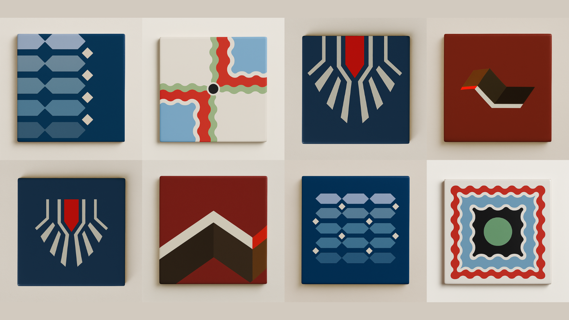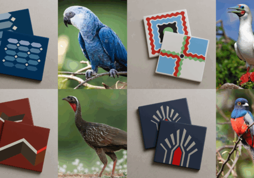 Foram realizadas diversas abstrações nos padrões gerados, aplicando princípios de design e a identidade de cada ave. A Ararinha-Azul gerou um padrão com losangos e degradê azul-acinzentado. O Atobá-de-Pé-Vermelho originou formas quadradas com malha ondulada. A Jacucaca resultou em linhas assimétricas que reforçam profundidade. Já o Surucuá teve abstração complexa, com foco em linhas que remetem à cauda da ave. Cada ladrilho teve variações para ampliar suas possibilidades de paginação.