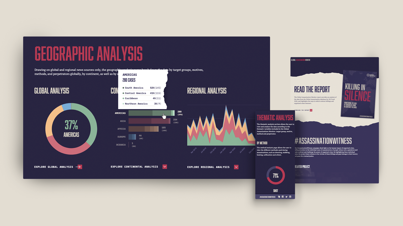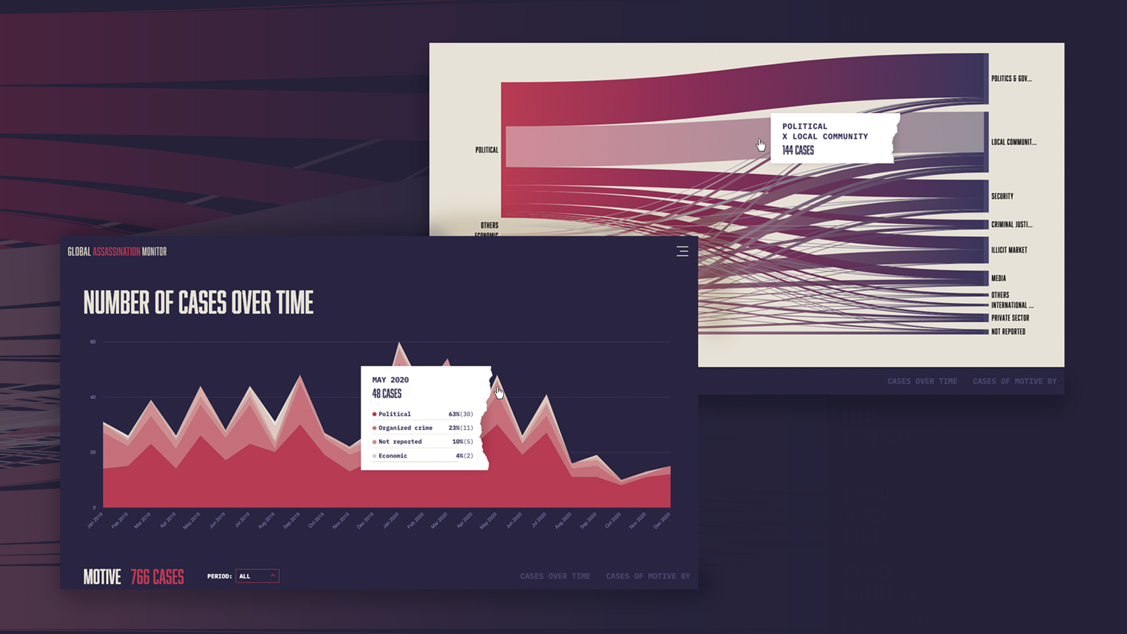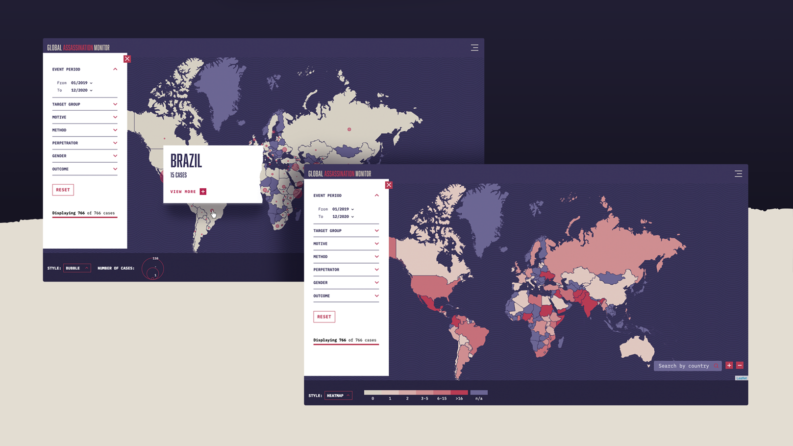 A solução foi criar uma plataforma interativa de visualização de dados que integrasse um banco de dados único sobre assassinatos políticos, com 16 categorias e 18 áreas geográficas. A interface permitiu que os usuários explorassem as informações por meio de gráficos interativos, mapas e filtros detalhados. Utilizamos visualizações incrementais, tornando o conteúdo acessível em diferentes níveis de complexidade, com detalhes que vão de análises gerais a dados específicos de cada país ou tema.