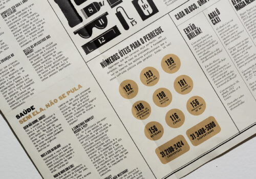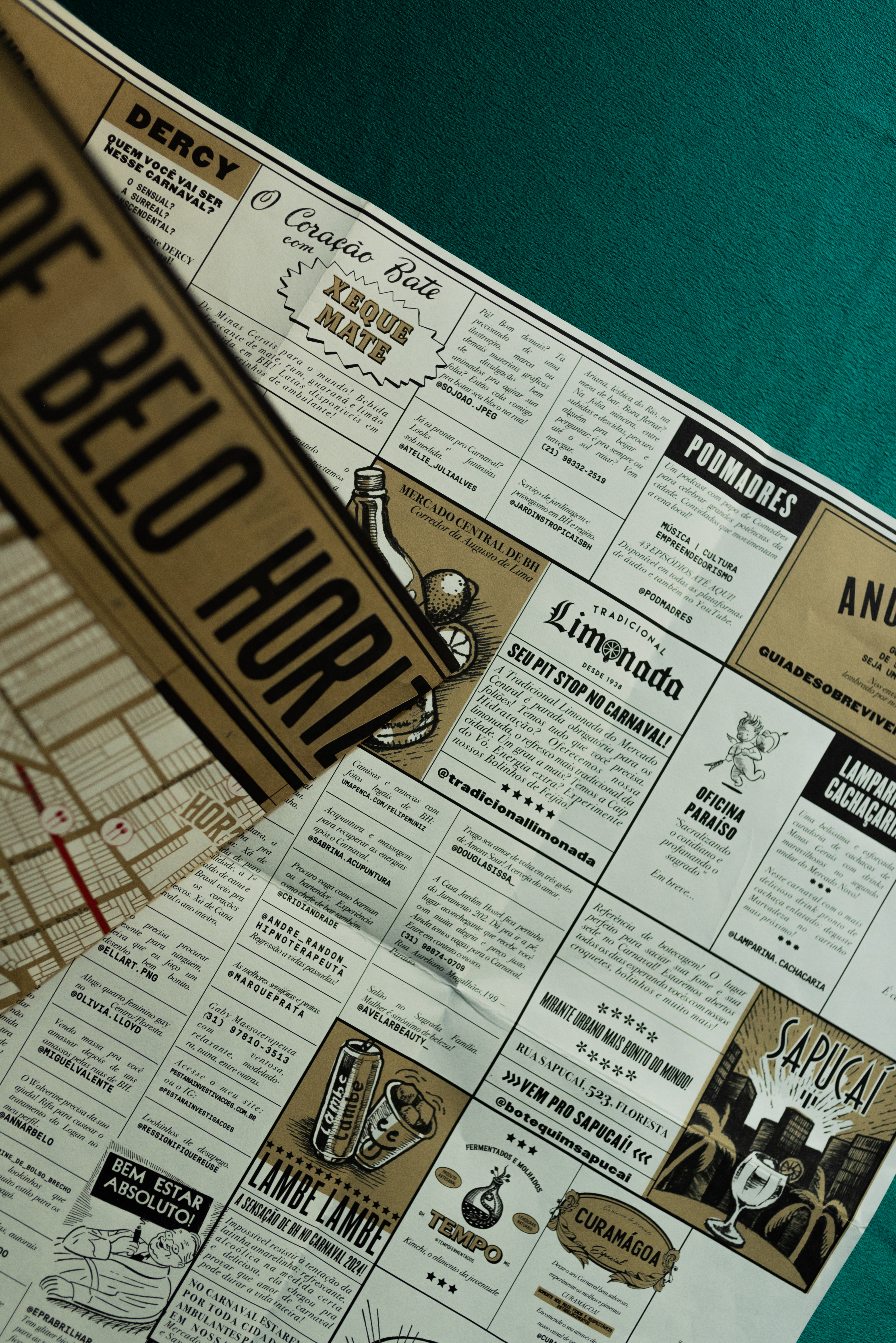 A solução foi criar um guia composto por um mapa detalhado e um projeto editorial. O mapa apresenta quase 200 pontos de interesse, como restaurantes, banheiros, transporte e áreas restritas, com iconografia própria para facilitar a leitura. No verso, dicas de segurança, saúde, números úteis e anúncios ilustrados, inspirados em classificados de jornal, tornam o material funcional, informativo e fácil de consultar.