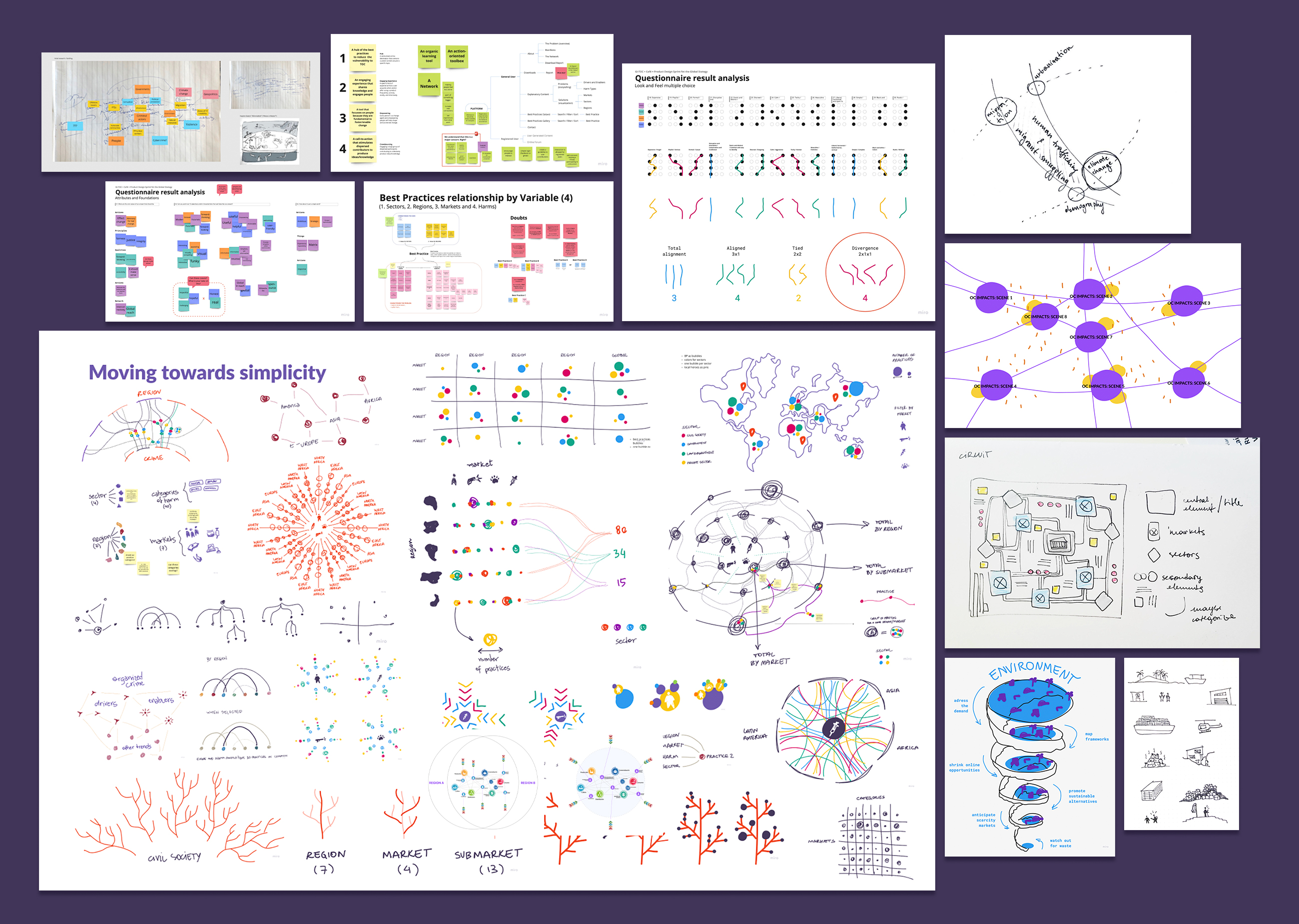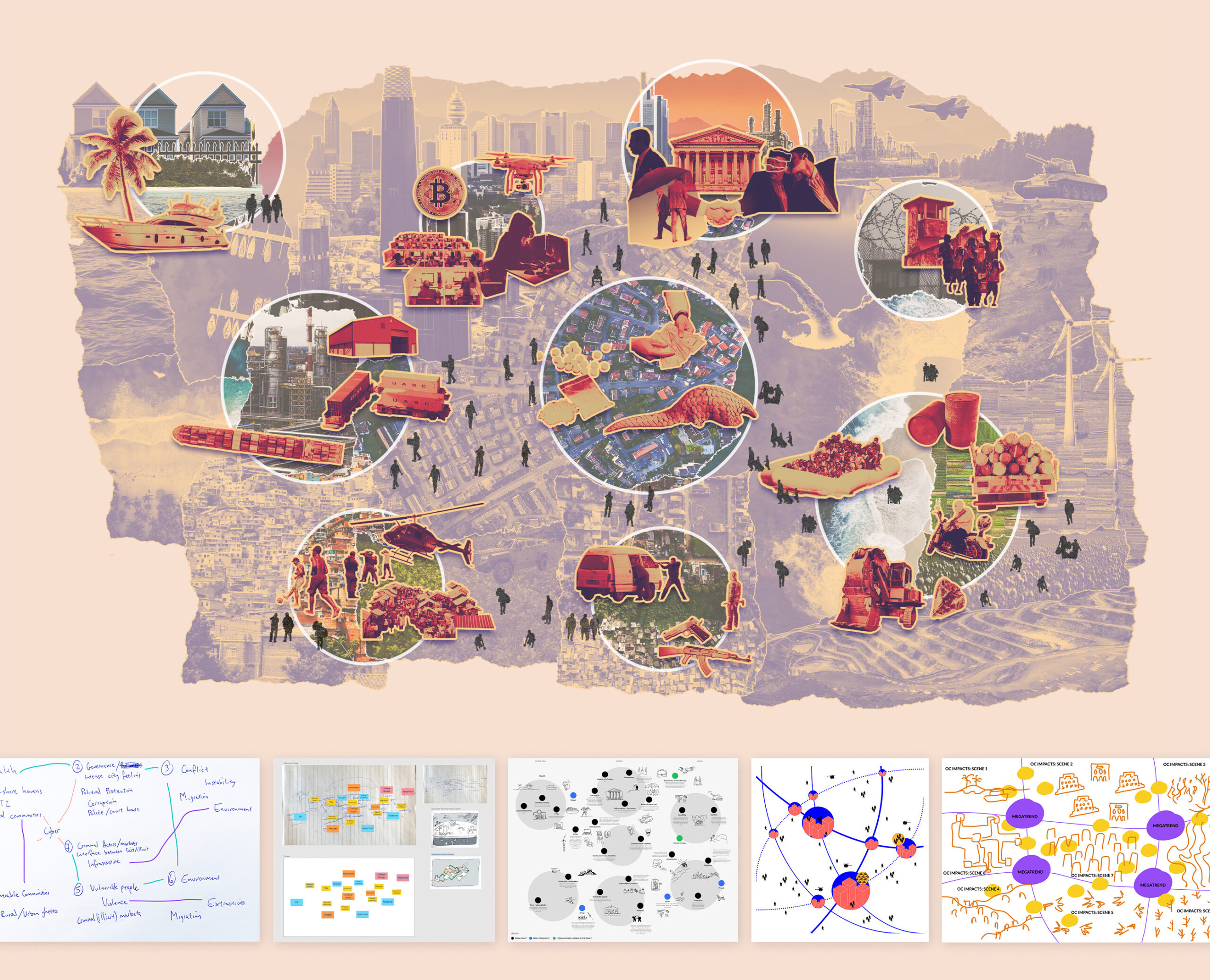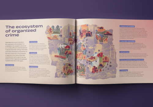 Intersections é um relatório inovador, resultado de um processo colaborativo com 15 especialistas globais em crime organizado transnacional (TOC). A partir dos princípios de Massive Change Design de Bruce Mau, buscamos explorar a definição de TOC, seus elementos, atores e geografia por meio de ilustrações, diagramas e infográficos. Com workshops em Viena e um processo colaborativo de 2 anos, Intersections reflete a proposta de uma estratégia global contra o TOC, integrando design e conteúdo.