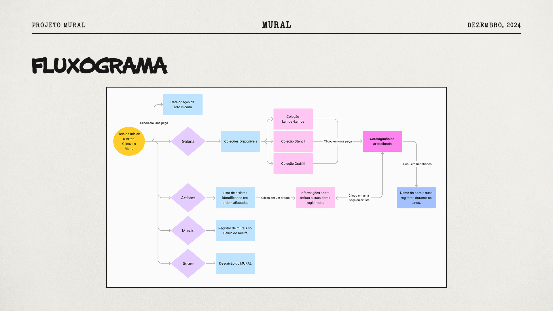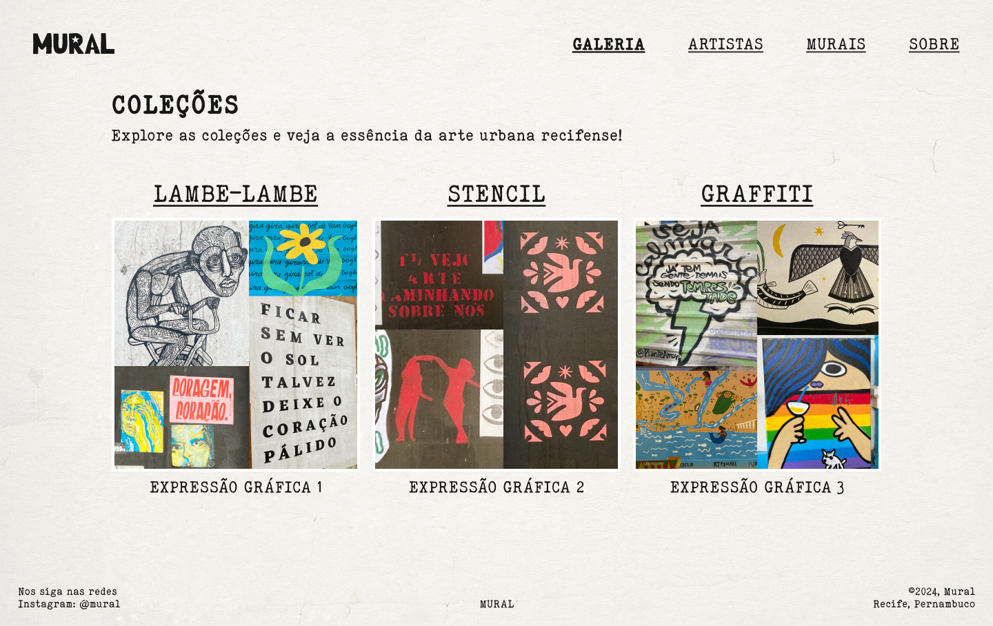 O projeto MURAL propõe a criação de um acervo digital para catalogar intervenções gráficas efêmeras no Bairro do Recife, destacando sua relevância para a memória urbana e o design da informação. Foram mapeadas e organizadas 206 obras, incluindo lambe-lambes, stencils e grafites, além da identificação de 30 artistas. Utilizando metodologias como design thinking e cartografia afetiva, o projeto resultou no desenvolvimento de um protótipo navegável com georreferenciamento e sistema de tags.
