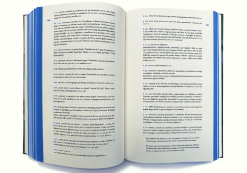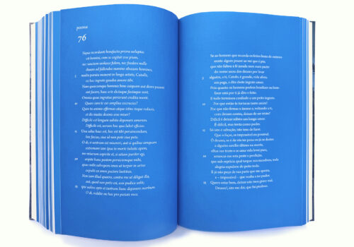 O pantone azul tornou-se uma marca distintiva do trabalho gráfico do livro, e sua instrumentalização para tornar funcional a identificação dos elementos do texto se soma a um projeto que foi norteado para enfatizar a localização de cada parte do livro: versos em latim na página esquerda sobre o fundo azul, sua tradução em português na página direita pareada, também sobre o azul, e os comentários do tradutor se seguindo em páginas sem fundo impresso.