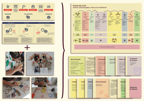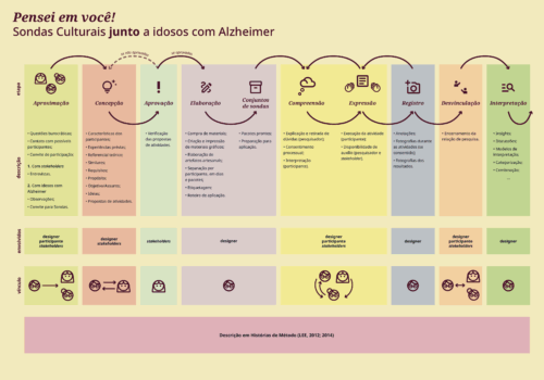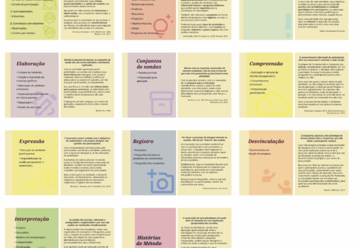 Desenvolveu-se uma síntese gráfica com orientações e cartões complementares do processo adaptado de Sondas, com organização visual e hierárquica de fácil compreensão. A síntese possui 8 etapas iterativas, com diferentes camadas de informação: descrição; envolvidos; e nível de vínculo. Incentivando o relato aprofundado sobre o processo, as Histórias de Método de Lee (2012; 2014) englobam tudo. Os cartões detalham as etapas, seguindo o conjunto de cores e visual da síntese, formando uma unidade.