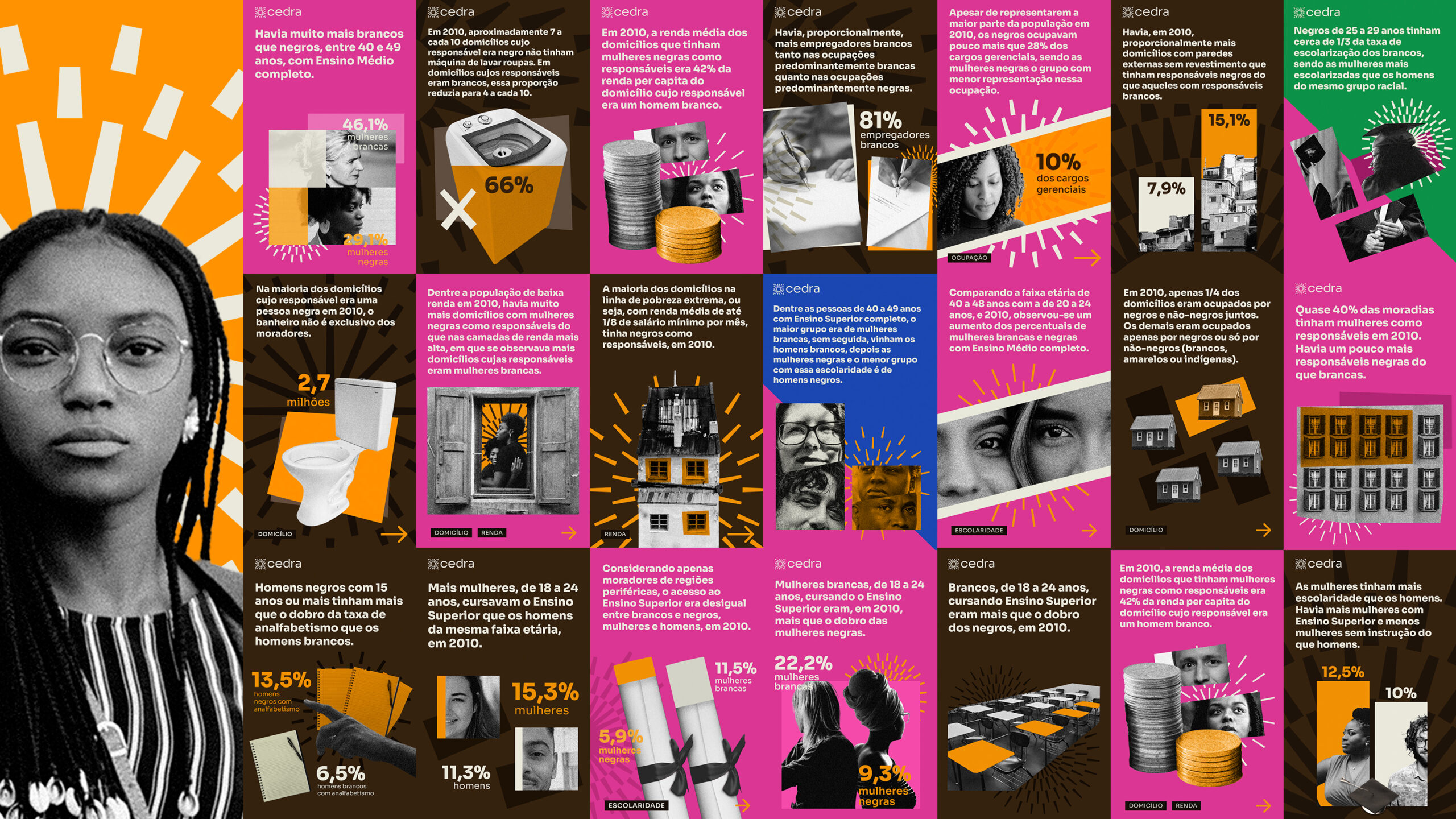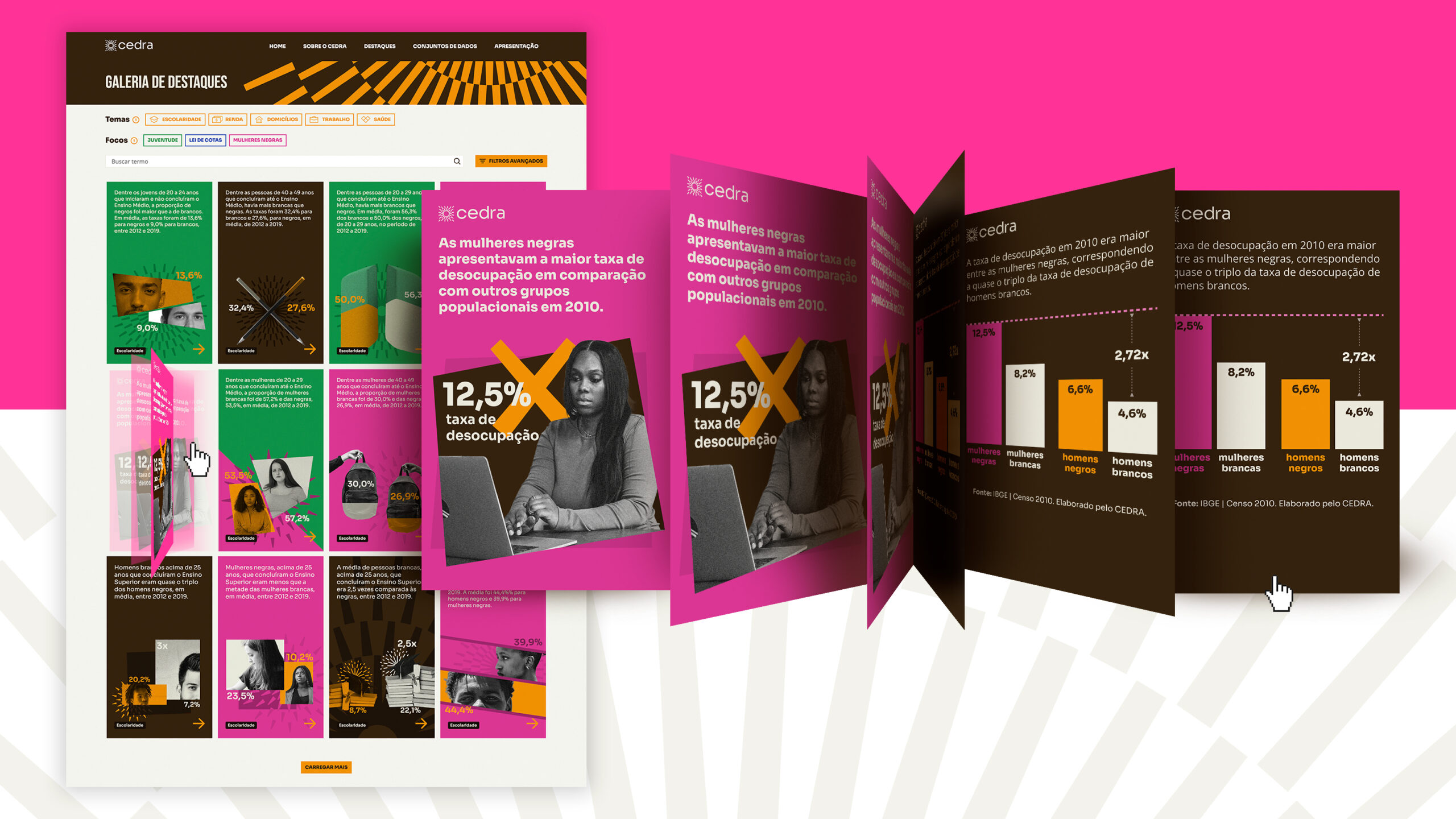 Desenvolvemos uma galeria de cards interativos com ilustrações que tangibilizam visualmente os dados sobre desigualdades raciais. No verso, os usuários podem acessar os conjuntos de dados completos. Para especialistas, criamos uma interface que organiza inferências estatísticas em tabelas consultáveis e baixáveis. O design integra acessibilidade, engajamento e confiabilidade, consolidando o CEDRA como autoridade na luta antirracista.