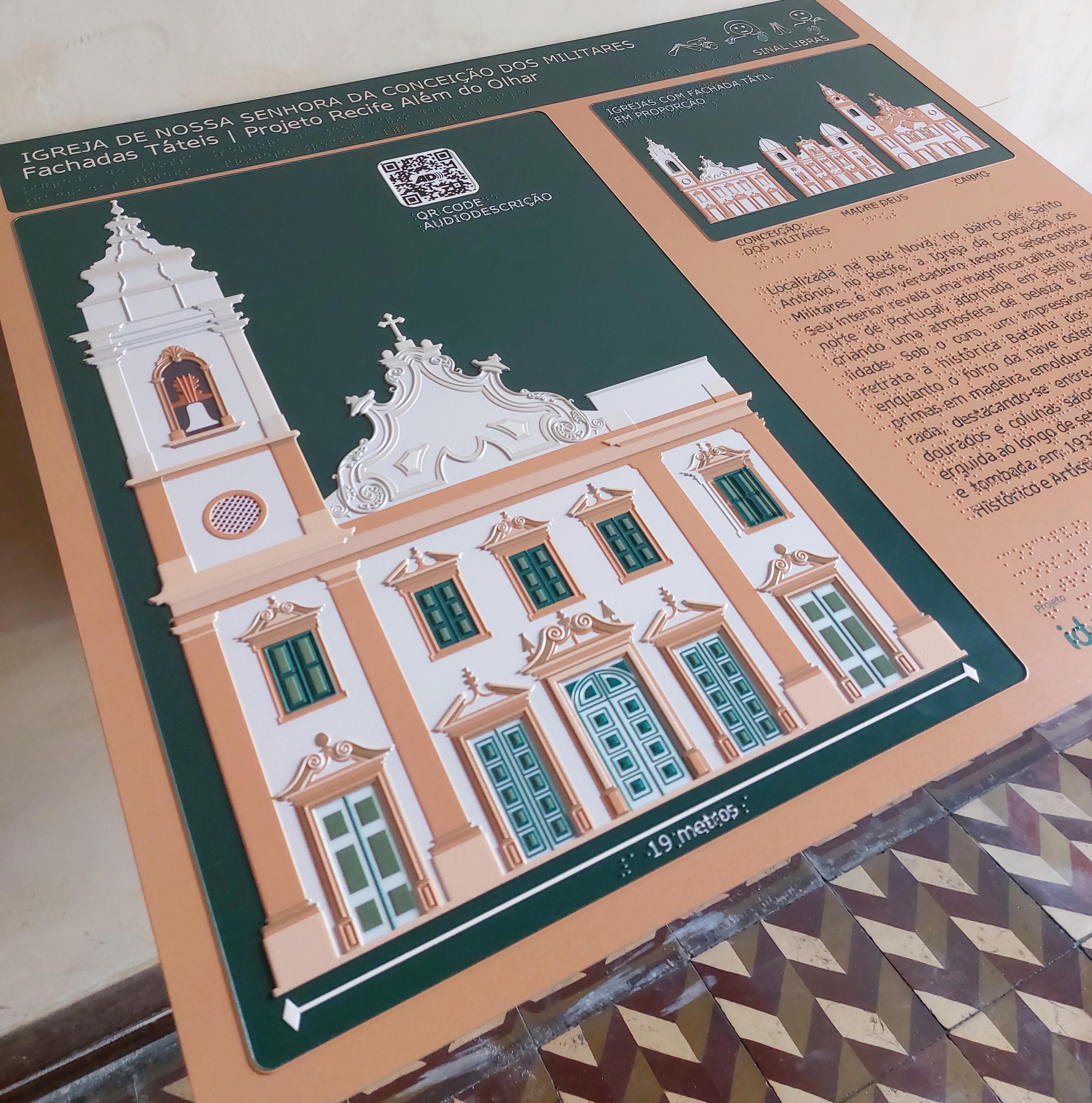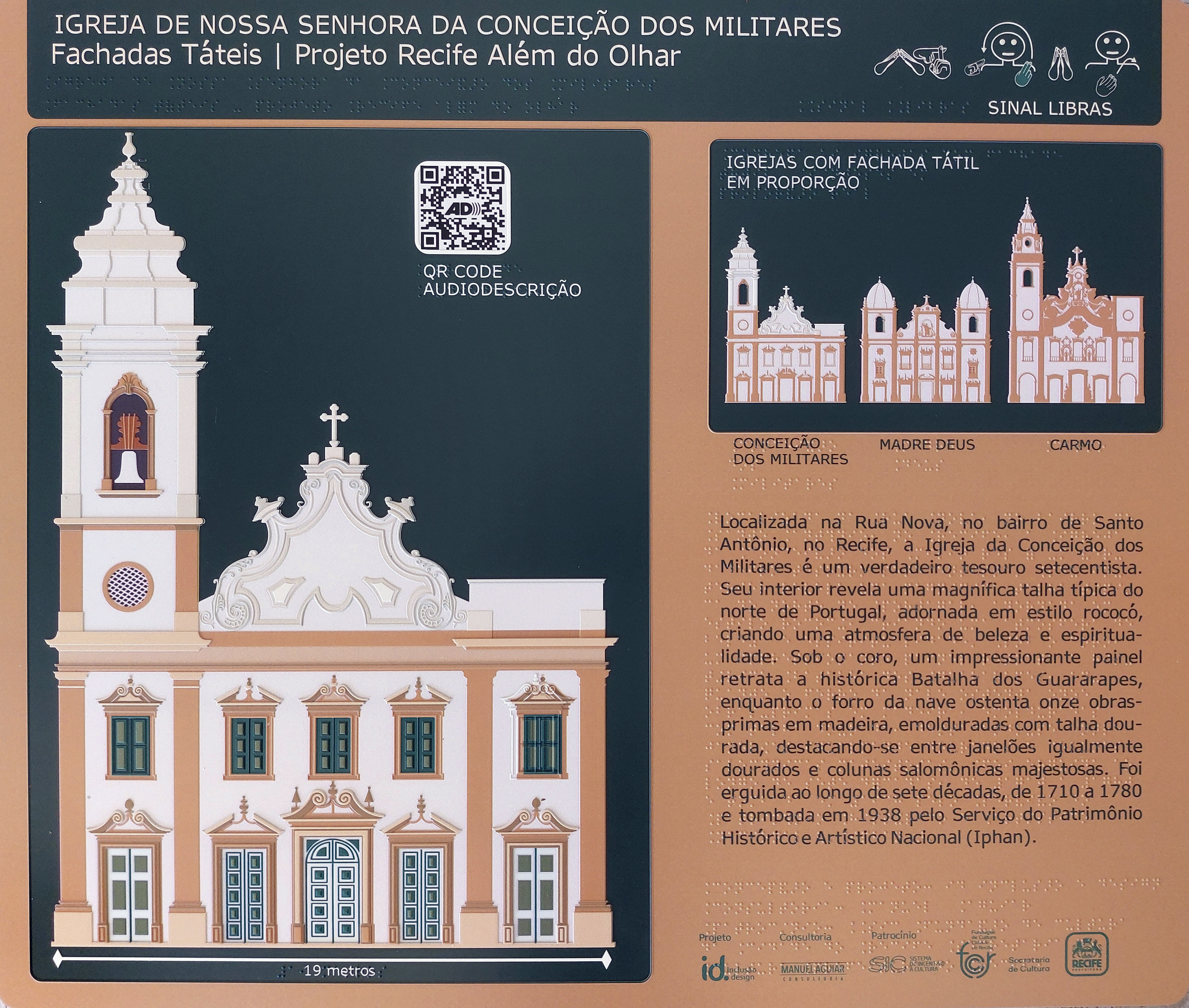 Painéis táteis sensoriais com recursos de acessibilidade que informam e valorizam a construção arquitetônica do patrimônio, apoia ações de Educação Patrimonial e Turismo, vinculadas à promoção da Inclusão Cultural da pessoa com deficiência e potencializando o turismo acessível. O Painel entrega ao público uma experiência com o monumento através da fachada tátil, dados históricos sobre o monumento (em letras ampliadas e Braille), sinal LIBRAS da Igreja, QR Code com audiodescrição.