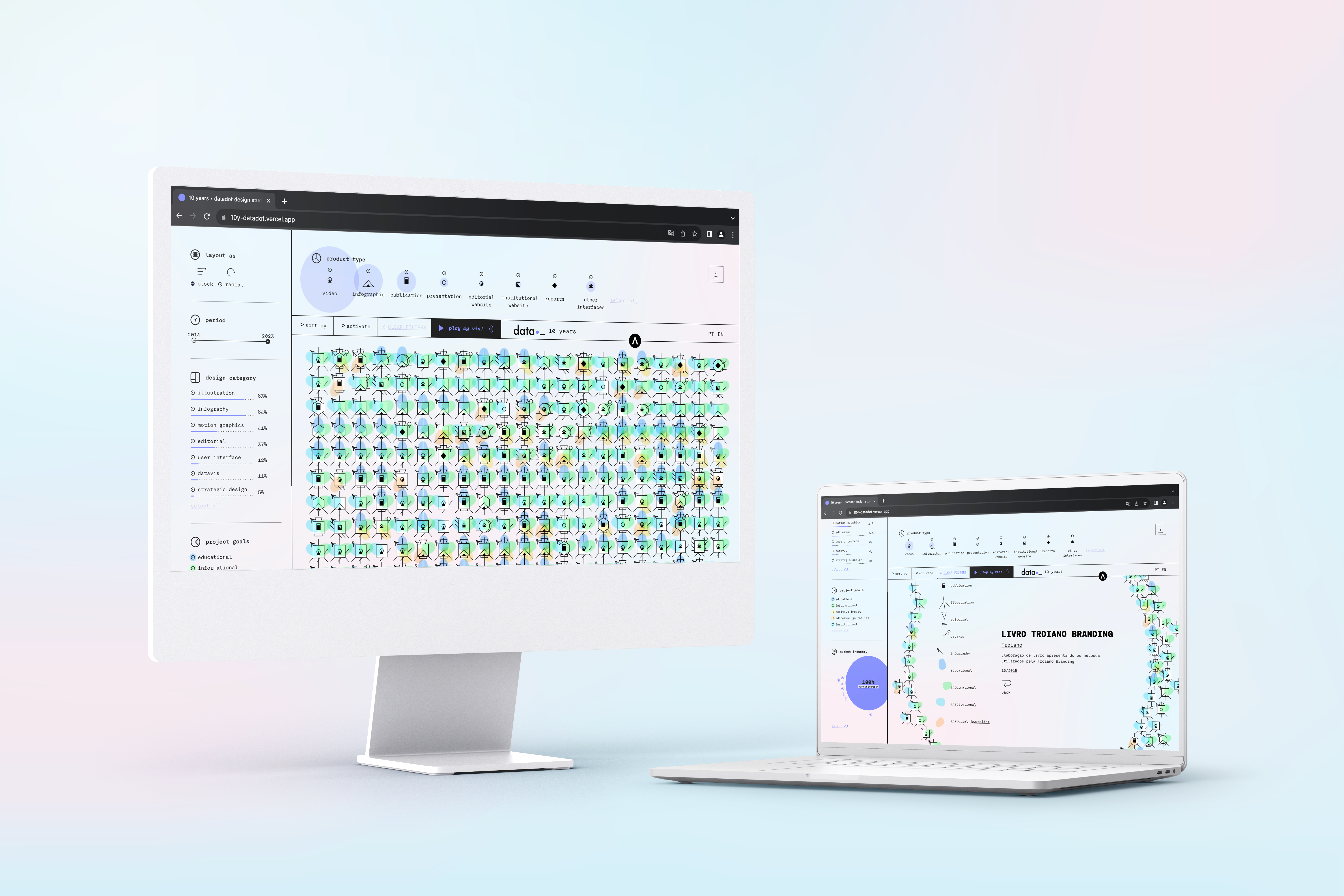 Projeto de visualização interativa para exploração da informação que contempla os 10 anos de trajetória de um estúdio brasileiro de design da informação. Por meio de uma base de dados estruturada com informações dos projetos realizados ao longo de uma década, a interface permite múltiplas formas de exploração visual e sonora da informação, incentivando a uma postura curiosa e o engajamento com a história do estúdio por diferentes enquadramentos de forma acessível e dinâmica.