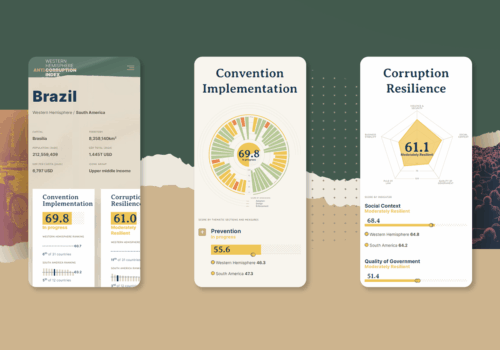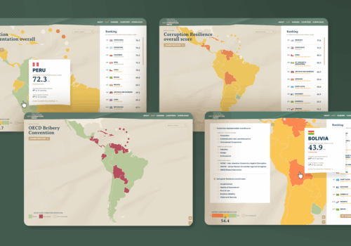 O desafio era transformar uma base técnica e densa de dados sobre convenções anticorrupção em uma ferramenta interativa, compreensível e comparável por diferentes públicos. O conteúdo exigia tradução visual de indicadores institucionais e jurídicos sem perda de profundidade analítica, promovendo leitura regional e por país. A plataforma precisava atender simultaneamente usuários especializados e leigos, ampliando o impacto dos dados produzidos.